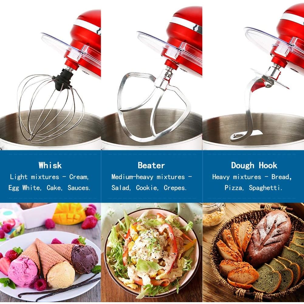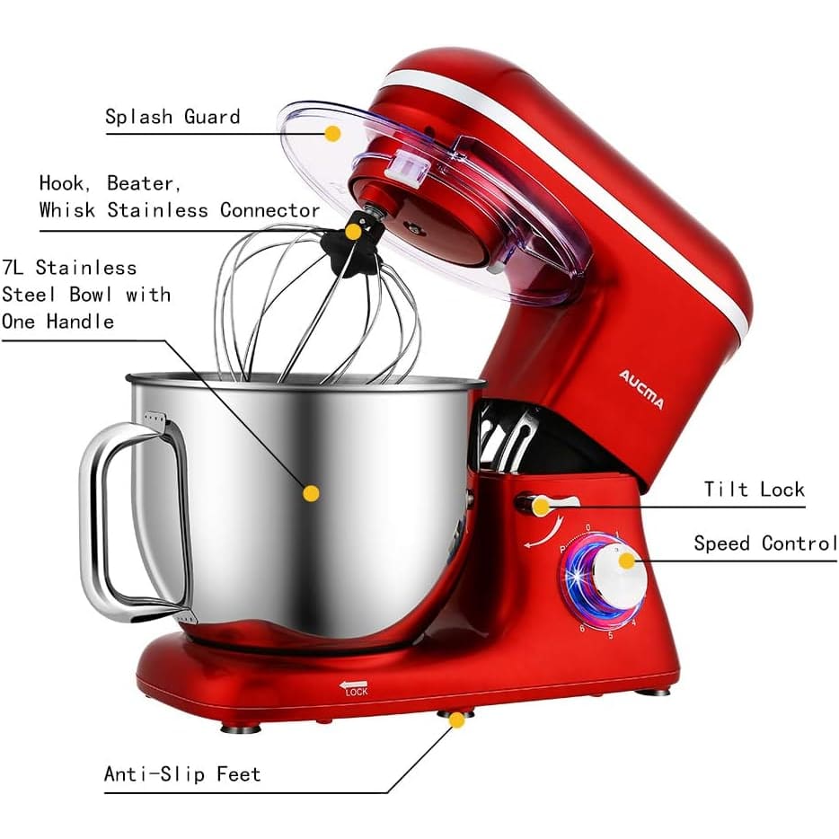 - 【MULTIPLE ATTACHMENT SET & EASY TO CLEAN】 Aucma Kitchen mixer comes with three mixing accessories: whisk, dough hook, mixing beater.The splash guard with access hatch helps add ingredients without making a mess.All accessories are easily detachable and clean.