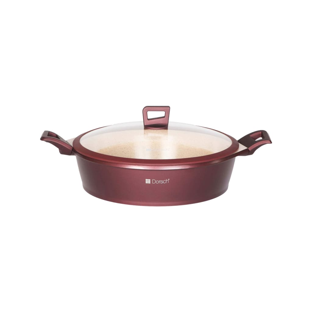 "Dorsch Premium Low Casserole - 28 cm aluminum pot with ceramic coating, silicone rim glass lid, and Bakelite handles, suitable for all cooker types, including induction."
