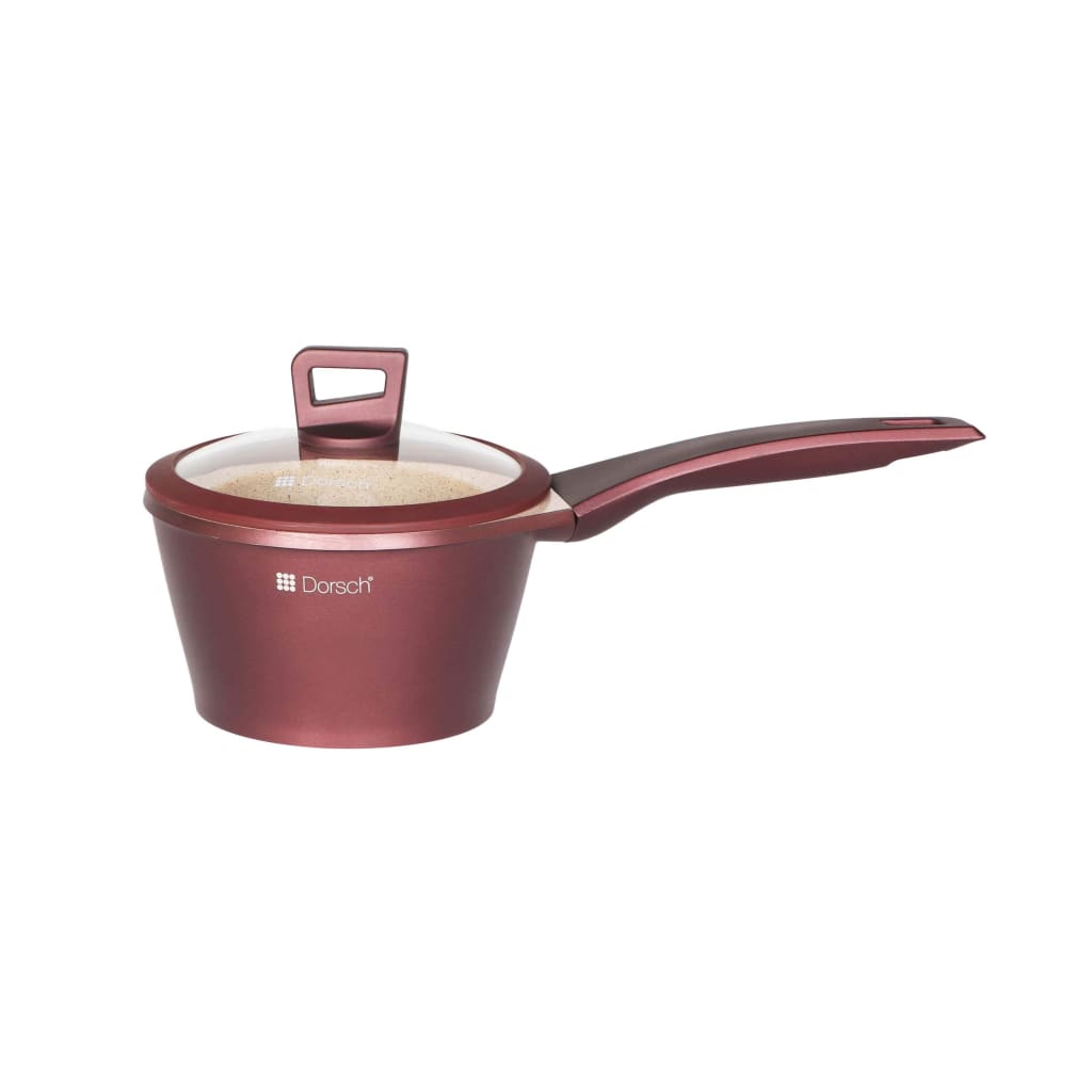 "Dorsch Premium Sauce Pan - 18 cm aluminum saucepan with nonstick coating, maroon finish, and silicone rim glass lid, suitable for glass-ceramic, gas, electric, and induction stoves."