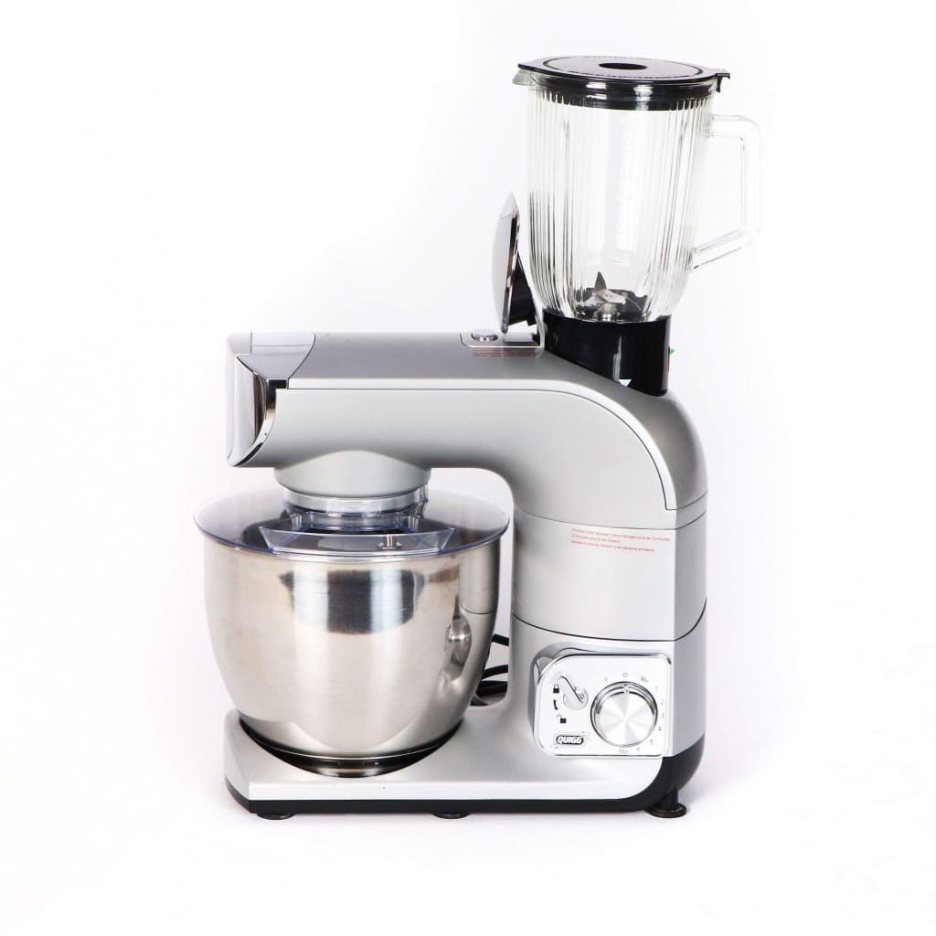 Hochwertiges Aluminium-Gehäuse – besonders robust. Inklusive Schneebesen, Rührquirl und Knethaken leistungsstarke 1.200 Watt 8 Leistungsstufen und Puls-Funktion Schwenkarm für einfaches Auswechseln der Zubehörteile 1 Edelstahl-Rührschüssel (Fassungsvermögen ca. 6 l) mit Spritzschutz-Deckel und Einfüllöffnung 1 Glas-Standmixer (ca. 1,5 l), z.B. für die Zubereitung von Milchshakes und Mixgetränken.