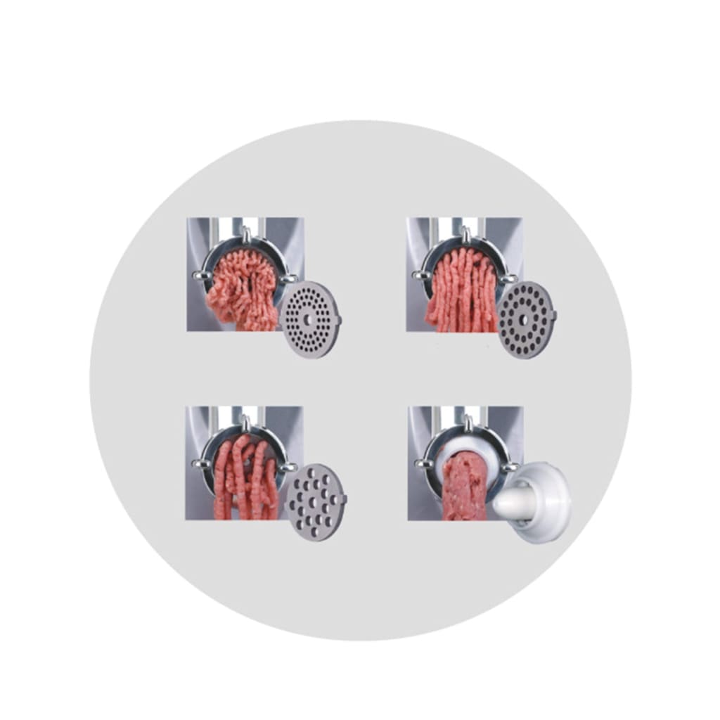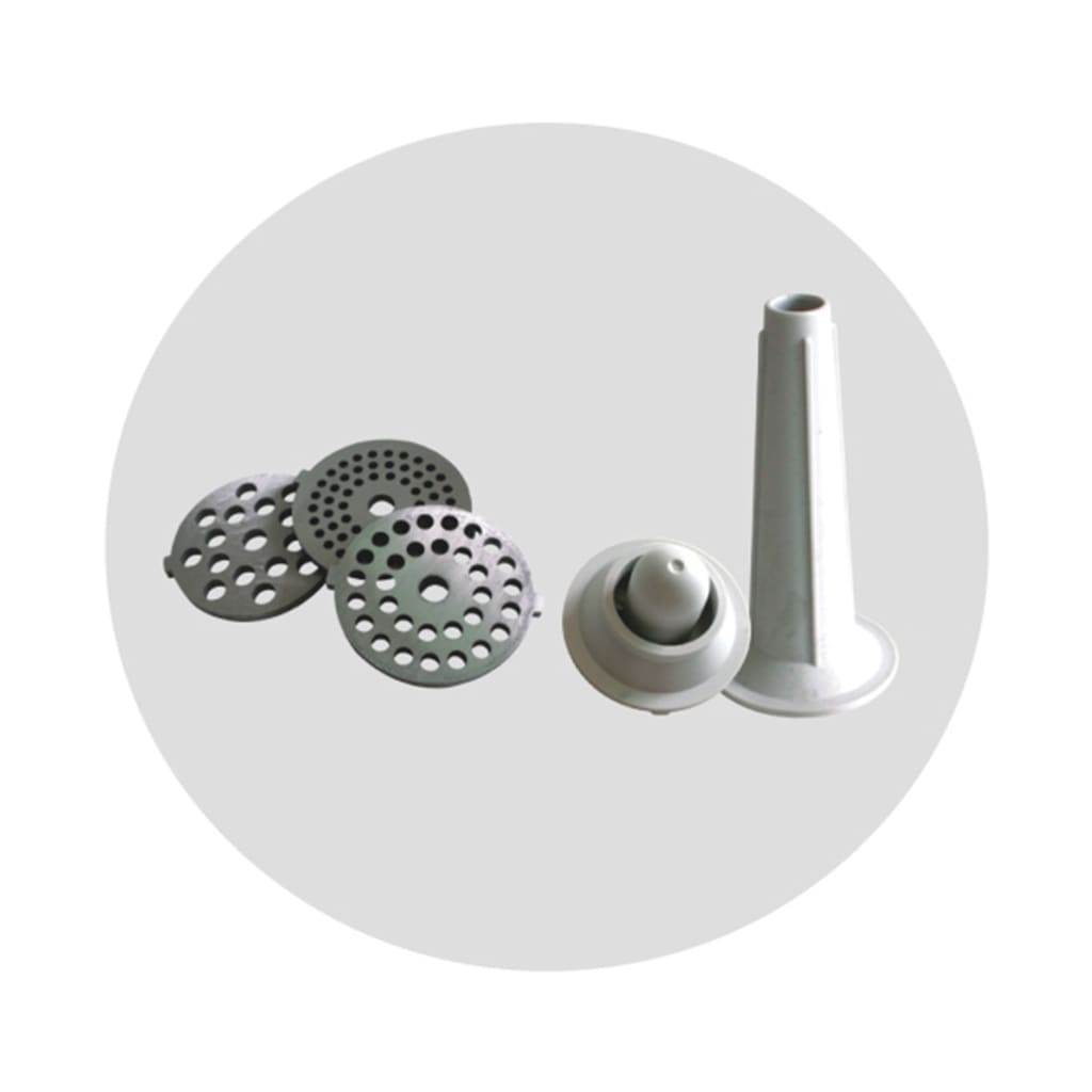 The set includes 2 perforated discs, as well as a kebbe and sausage attachment. The meat grinder is equipped with a reverse system for the most convenient operation.